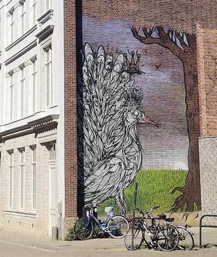 Du côté de Groenendael, les œuvres de Dzia prennent place sur un écoduc, au coeur d’une voie rapide. Ici, chauves-souris, amphibiens et autres espèces locales apparaissent sur les piliers, comme un rappel de ce qui se joue autour.