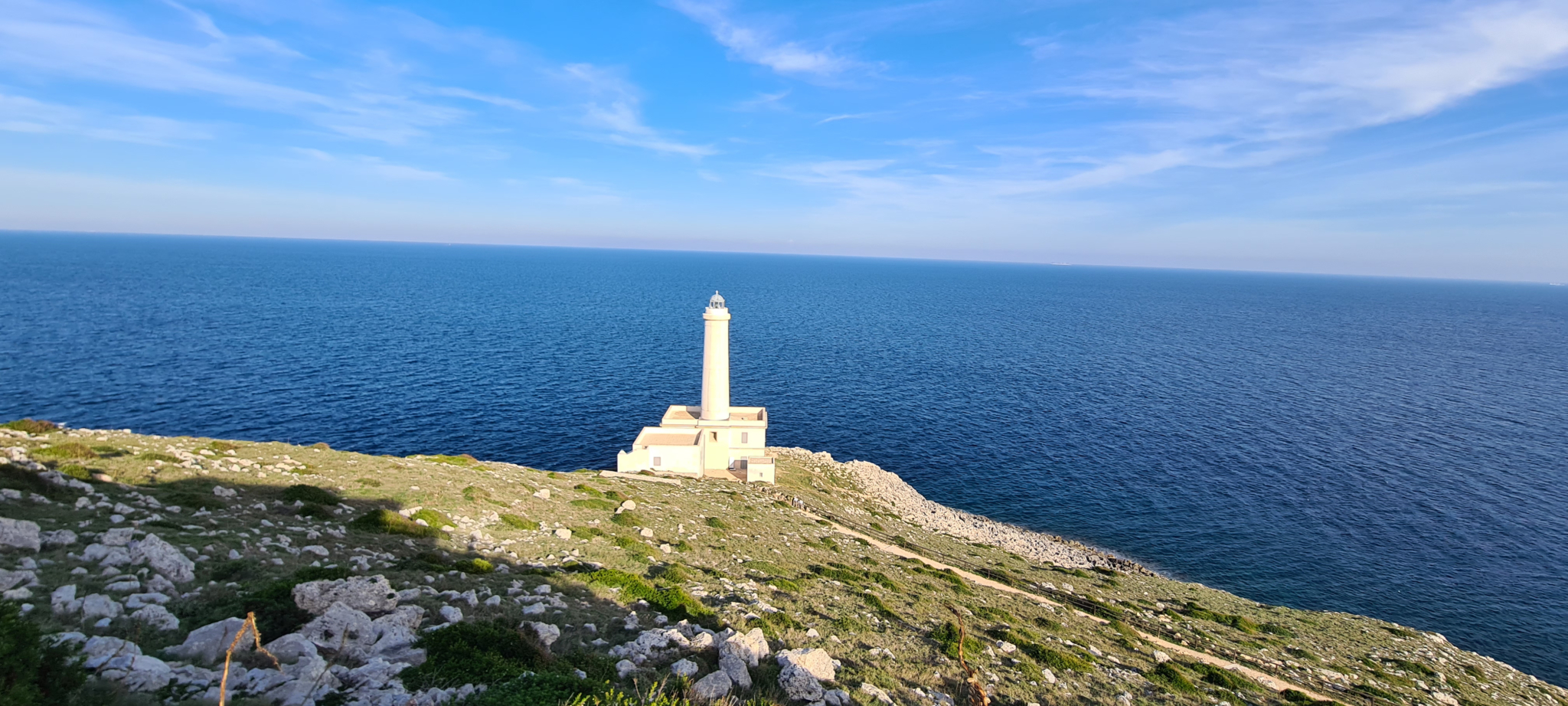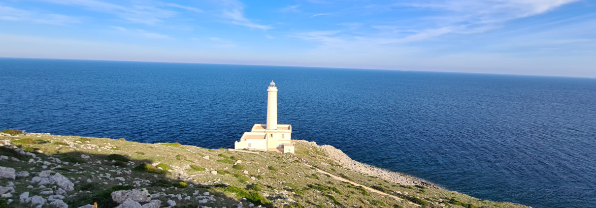 L’arrêt suivant nous mène par un petit sentier au phare le plus à Est d’Italie. Il paraît qu’on aperçoit les montagnes de l’Albanie et les îles grecques quand les journées sont claires. Mais j’ai eu beau écarquiller les yeux, je n’ai vu que la mer à perte de vue !