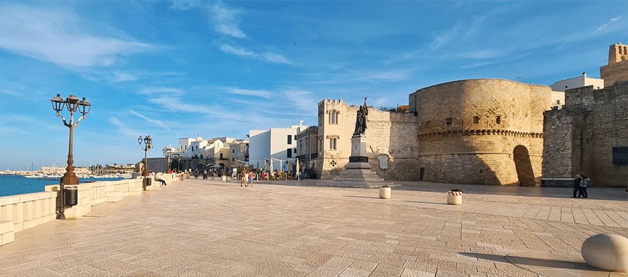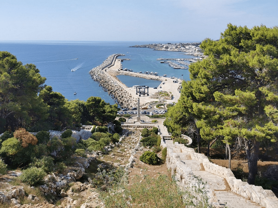 Près du vieux port, un double escalier monumental de 300 marches permet d’accéder au promontoire de la basilique et au phare. Il s’agit en réalité de l’extrémité de l’aqueduc des Pouilles construit sous Mussolini. L’eau étant bien trop précieuse, la cascade du milieu ne fonctionne plus que quelques jours par an.