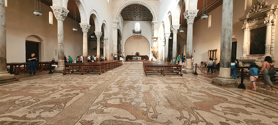 La cathédrale normande, assez massive de l’extérieur, recèle une véritable pépite : tout le sol est couvert d’une mosaïque datant du XIIe siècle réalisée par un jeune moine du nom de Pantaleone. Elle représente un arbre de vie, dont les branches sinueuses abritent des scènes bibliques, des monstres, des animaux, des figures mythologiques et des symboles de corporations.